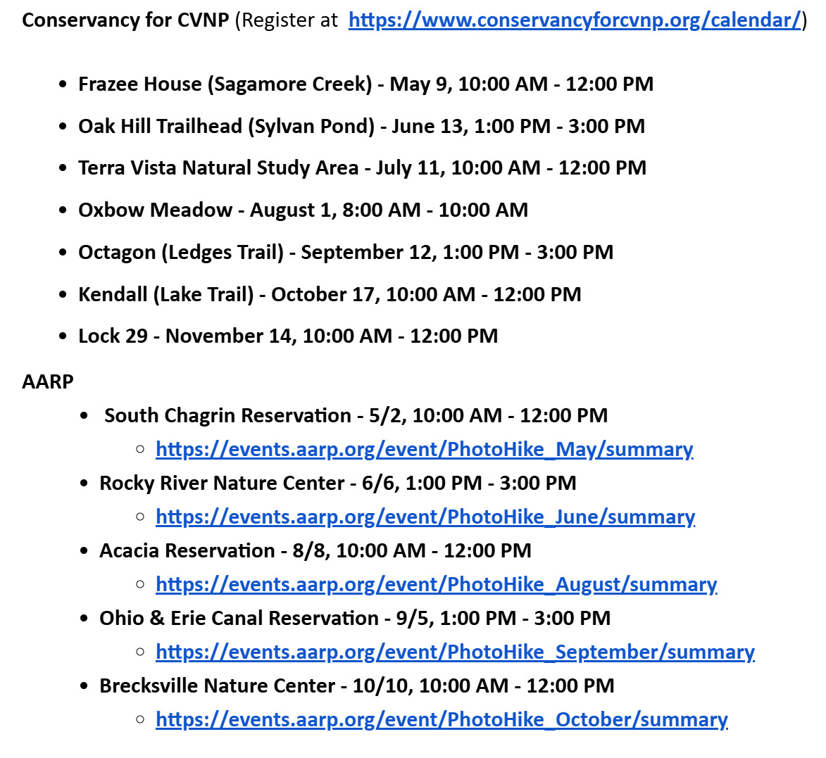 National Park Service volunteer photographer Rick Santich, in conjunction with the Conservancy for Cuyahoga Valley National Park, will be conducting 10 Photo Exploration Hikes from February through November. See his schedule here. There is no cost, but to keep the groups at an appropriate size, please register for the specific walk here. NEW WALKS. Rick has partnered with AARP to do additional hikes. A list of those hikes with his already scheduled hikes can be found here.